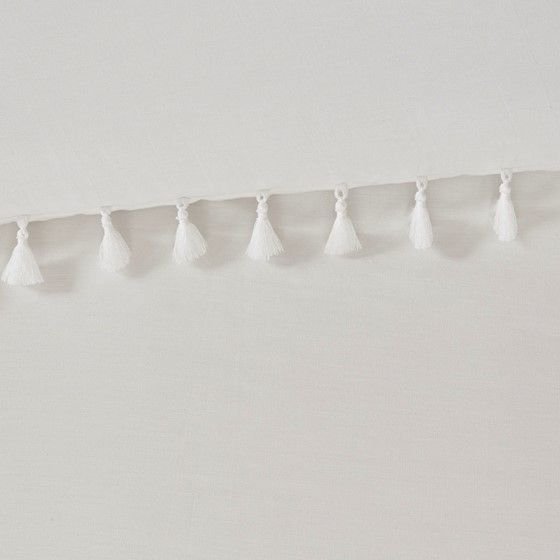 Duvet/Sham: cotton percale with tassel-trimmed edges, cotton/polyester reverse;